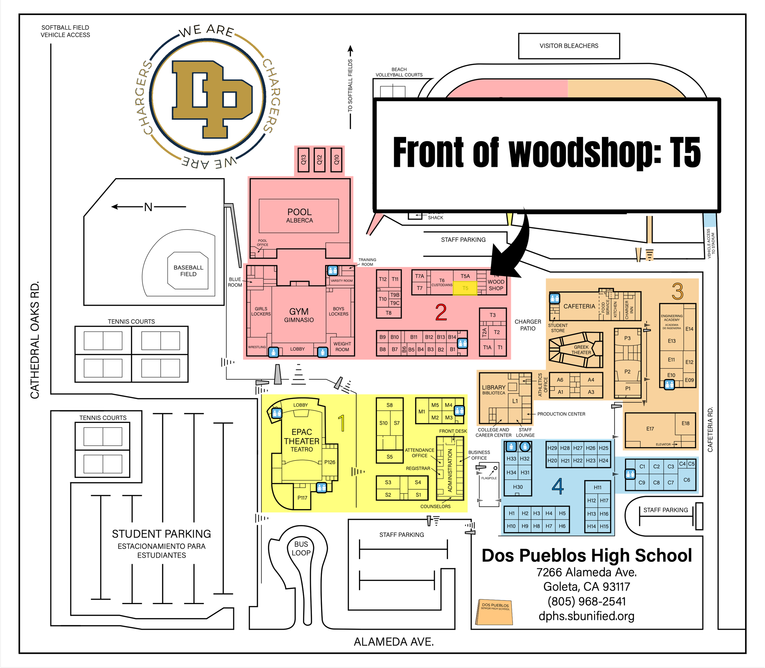 Mondays, Wednesdays, and Fridays from 6-9pm and Saturdays from 10am-6pm. During this time the team is designing, coding, assembling and practicing with a new robot for the year before competing in Regional events with teams from California and visitors from around the world. Meetings take place in the back of the wood shop room at Dos Pueblos High School.